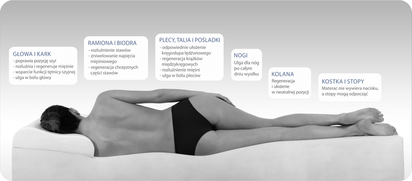 Podstawowym zadaniem materaca jest wspomaganie naszego kręgosłupa w odpowiednim ułożeniu się, co stanowi fundament profilaktyki i leczenia dolegliwości bólowych. Pewnie wielu z nas doświadczyło dyskomfortu związanego ze spaniem w niewłaściwej pozycji, przez co później w trakcie dnia doskwierały nam bóle mięśni lub stawów. Podobnie w drugą stronę, gdy ułożenie naszego ciała będzie prawidłowe, powinniśmy odczuwać ulgę i efekt relaksu. Pamiętać należy, że prawidłowy materac podpiera ciało i relaksuje tak, aby można było spać w najlepszych pozycjach, czyli na boku i na plecach. Wtedy to kręgosłup odpoczywa najlepiej.